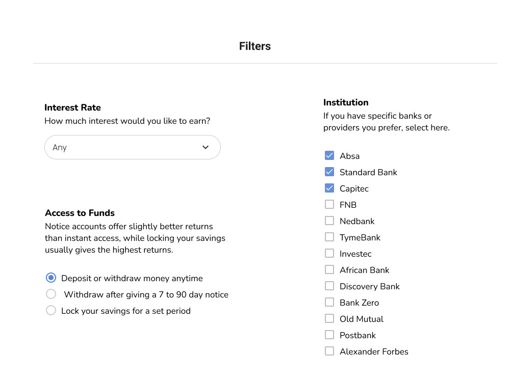 Use simple filters to find accounts that match your needs — by interest rate, access to funds, or your preferred bank.
